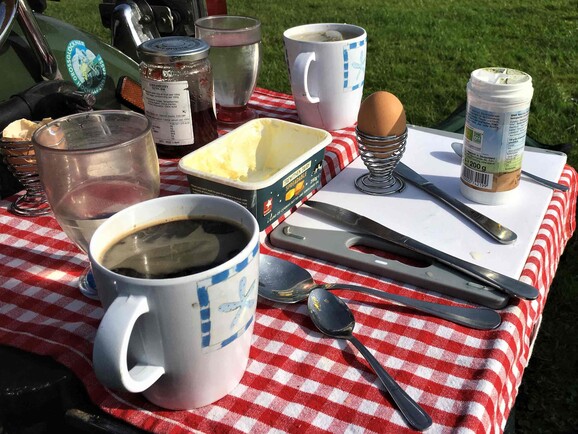 Am späten Nachmittag erreichen wir den Farmcamping in Easleigh. Es sind nicht viele Camper da, wohl weil die Farm etwas oben in den Hügeln liegt. Es ist sehr ruhig und angenehm. Zum Frühstück dampft der Kaffee ums Motorrad und der Geruch von gebratenem Speck mit Spiegeleiern, also Ham and Eggs, lässt manch andere Camper neidisch dreinschauen. Es macht aber jeder sein Frühstück und so bleibt der Speck und die Eier ganz alleine uns.