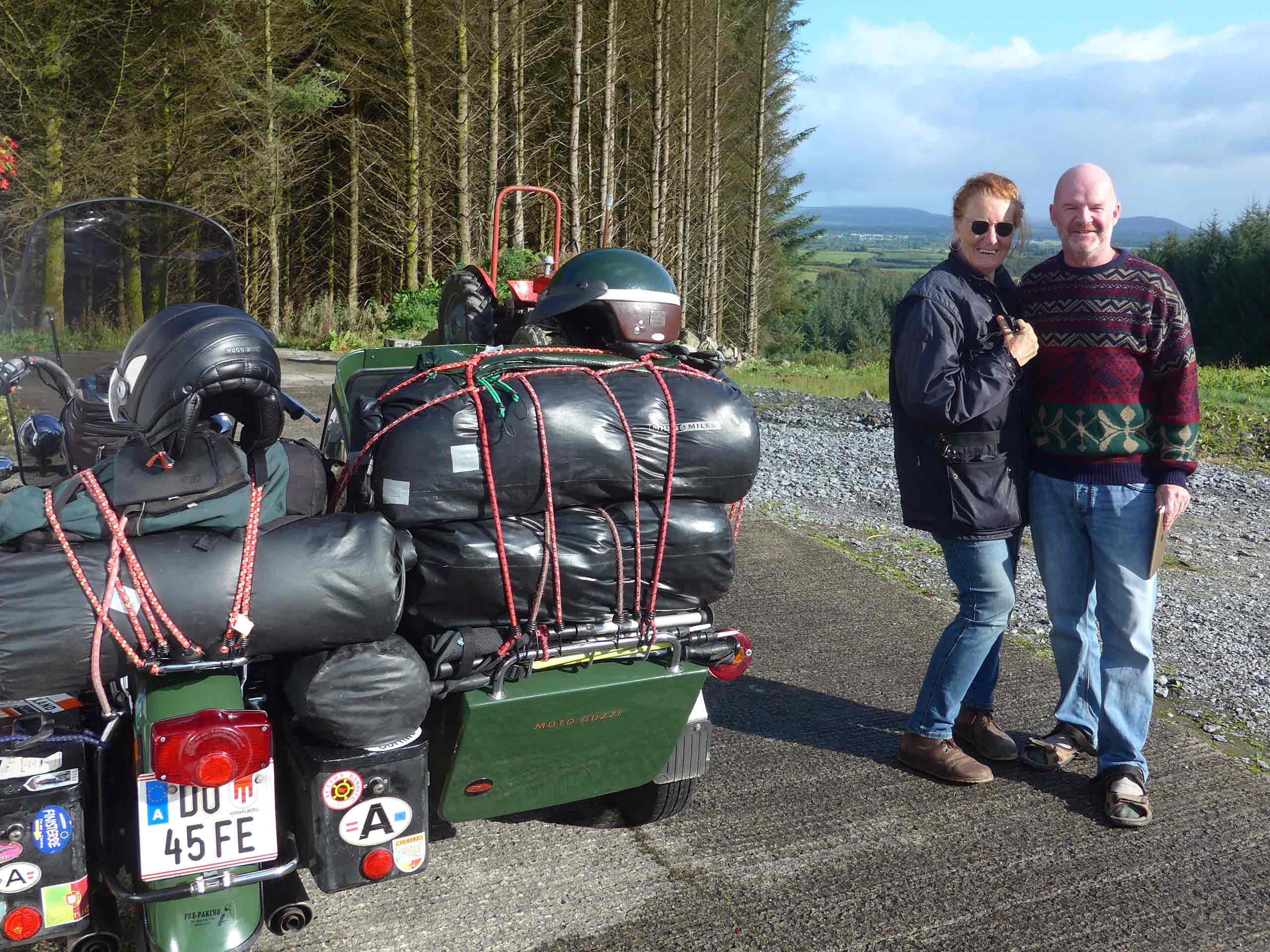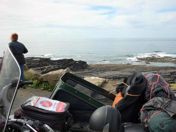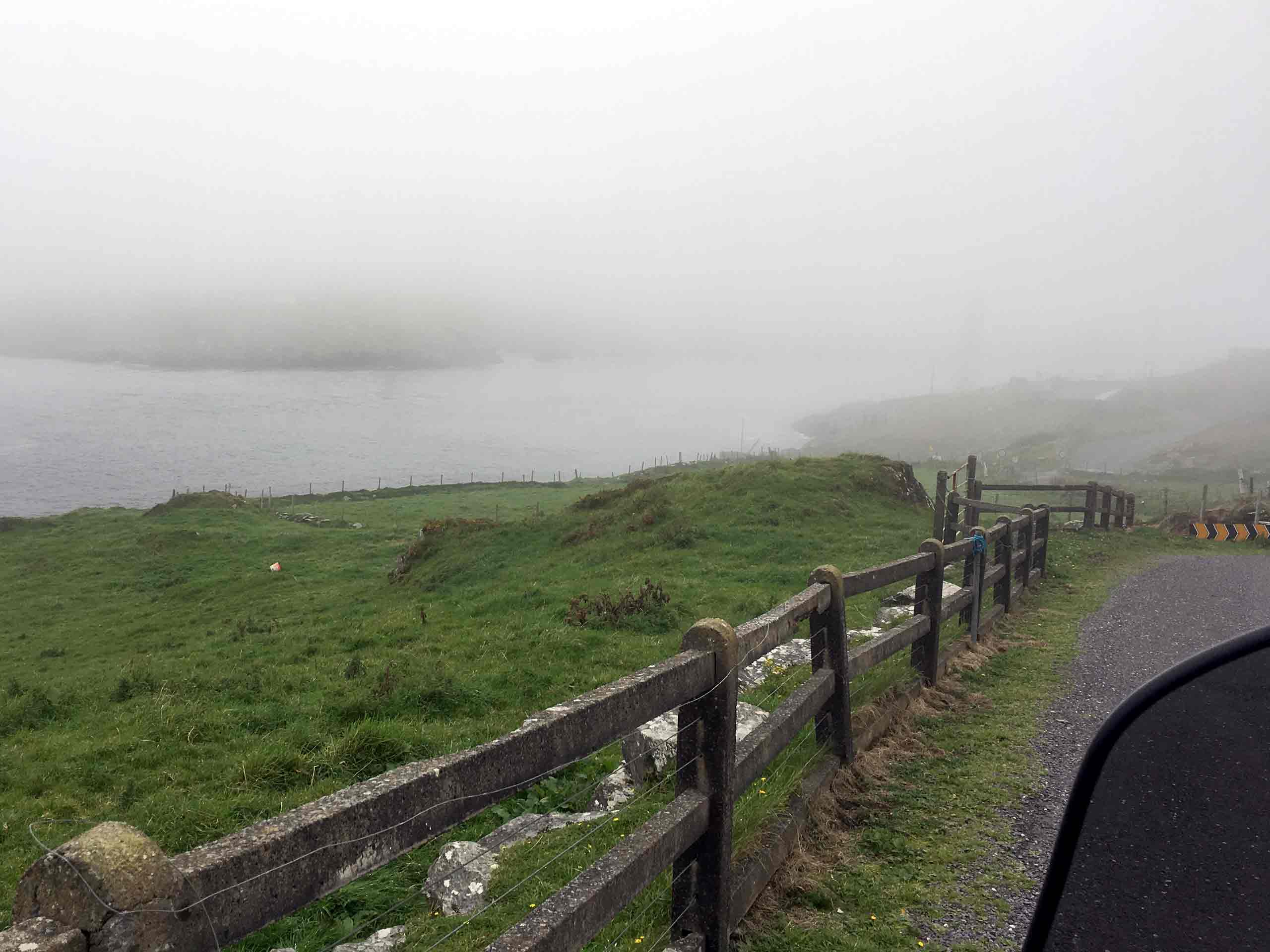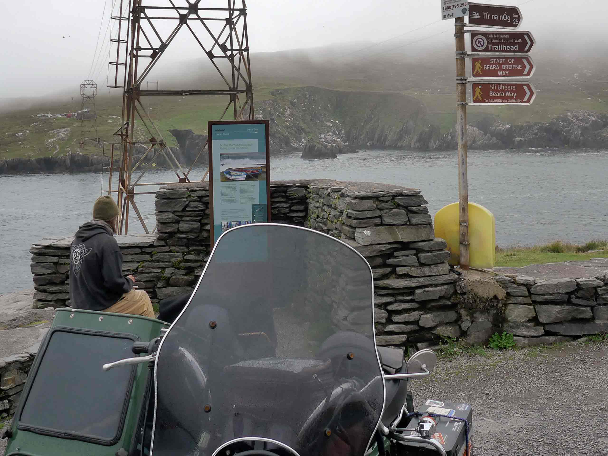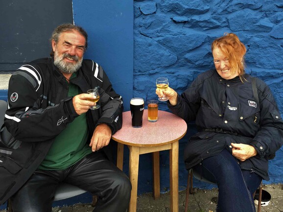 Hier kehren wir in Fisherman’s Bar & Skelling zu. Es ist regnerisch und ziemlich kalt daher ist es auch Zeit für den ersten Irish Single Malt Whiskey. Noch bevor ich zum bestellen komme möchte ein Gast Auskunft von uns haben, woher wir denn sind. Schon bei der ersten Frage stellt er uns zwei Whisky Gläser hin und meint, den würden wir sicher vertragen bei diesem schönen irischen Wetter. Gleich sind wir umringt von ein paar Gästen. So versuchen wir eben, ihre Neugier mit unseren Abenteuern zu befriedigen. Da wir aber heute noch eine tolle Strecke vor uns haben, müssen wir nach dem zweiten Glas abklemmen. Das halbe Lokal begleitet uns vor die Tür und möchte unseren Start anschauen und fotografieren. Ein kräftiger Ire möchte gar Ulli in den Beiwagen heben, dem sie jedoch flugs zeigt wie sie in die Kiste kommt. Unter bravo Rufen drehe ich eine kleine Runde auf dem Schotterplatz bevor wir wieder auf der Straße sind und mit Getöse davon brausen.