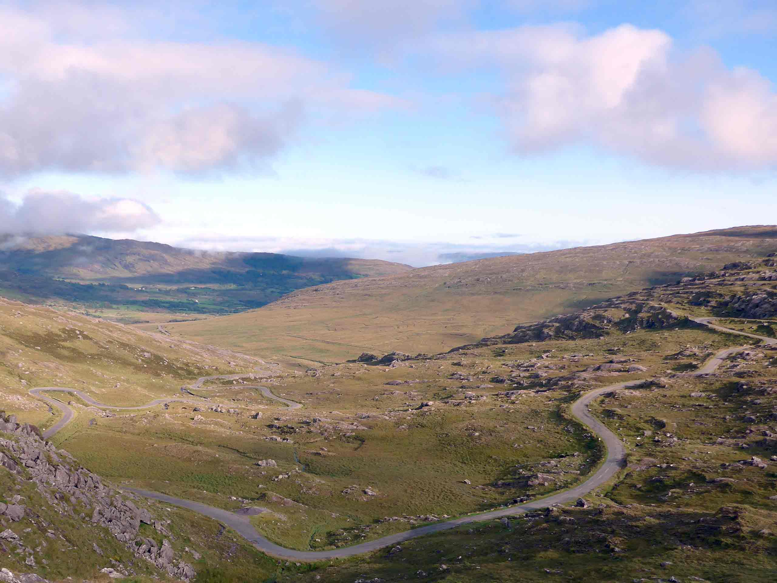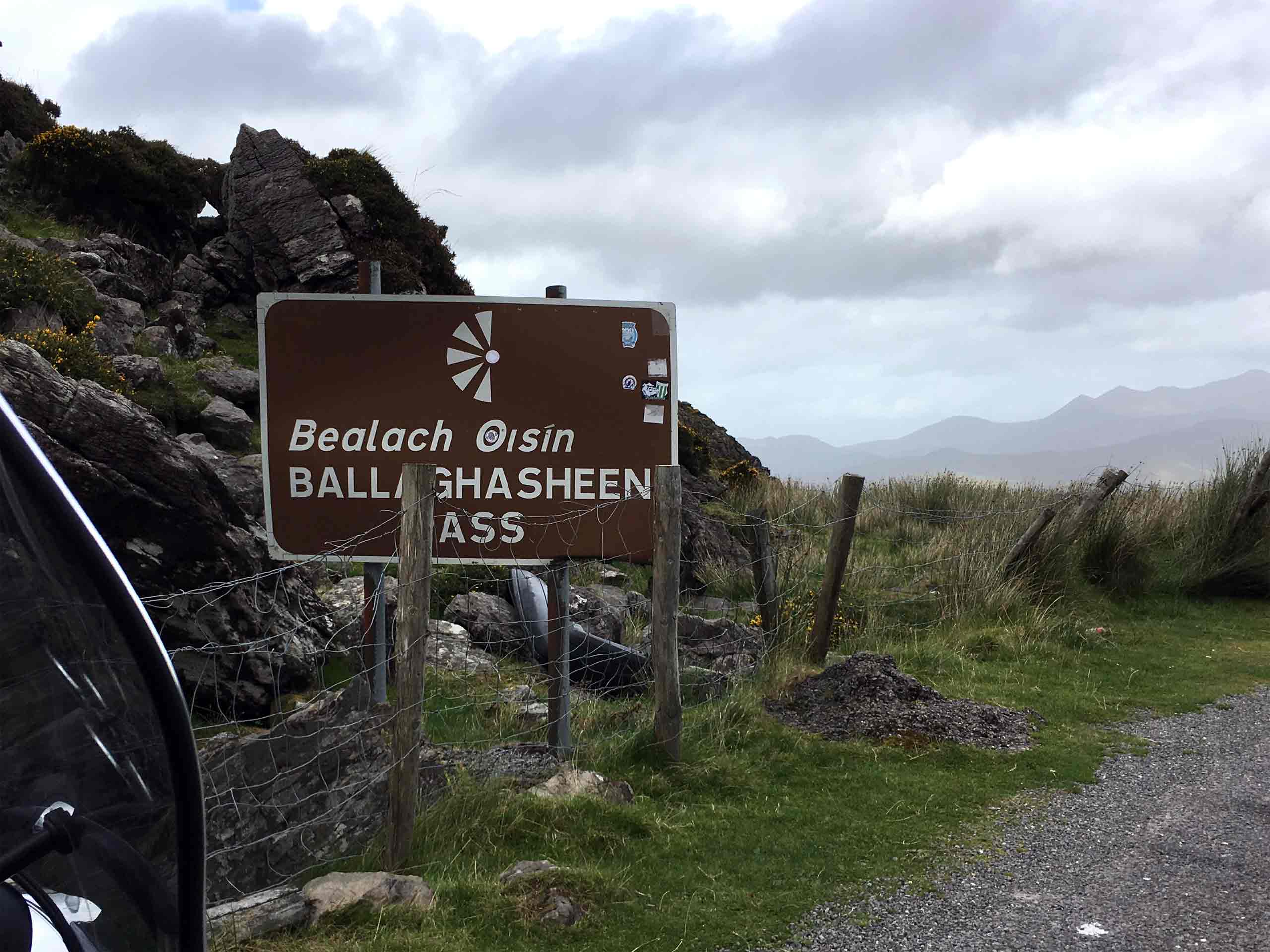 Kurz nach der Querung eines Rivers fahren wir wieder eine kleine Straße durch ein langes Tal zum Ballaghbeama Gap. Ein kleiner Pass, der tief eingeschnitten zwischen zwei spitzen Bergen liegt. Es ist ein landschaftlich sehr grünes Tal, immer mit Blick auf den 773m hohen Mullaghanattin. Dieser ist bis hoch hinauf überwuchert mit meterhohem Adlerfarn. Dazwischen sehen wir immer wieder kleine Steinhütten, gedeckt mit Steinplatten, ohne Fenster und nur offene Türen. Es sind wohl nur Zufluchthütten bei Unwettern für Jäger und Hirten. Es geht durch ein menschenleeres Gebiet in dem nur das Donnern unserer Guzzi zu hören ist. Im oberen Teil sehen wir unzählige weiße Flecken, Schafe. So geht es immer leicht bergauf. Erst am Schluss wird es doch bis zum Pass ziemlich steil.
