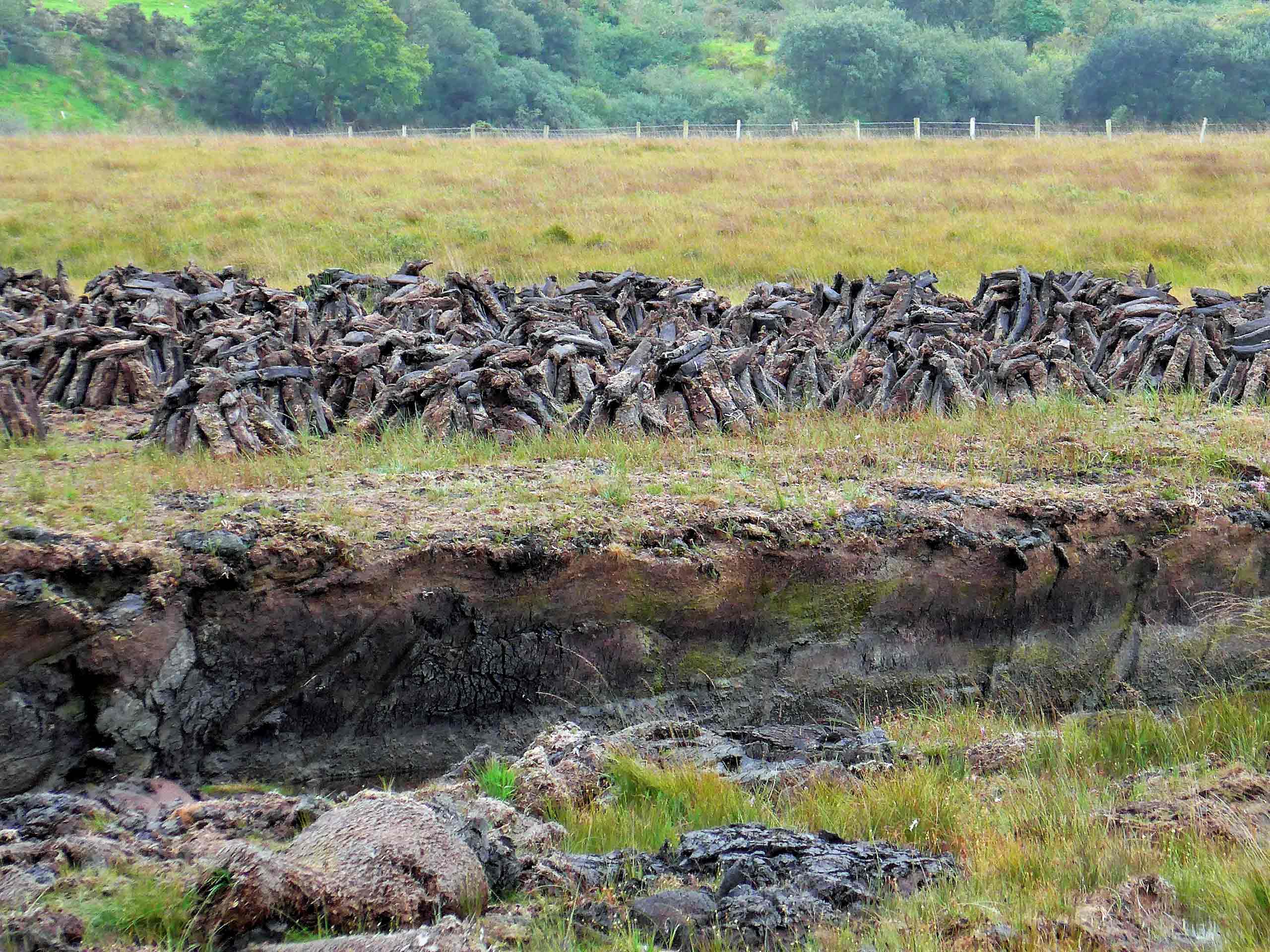 Bald fahren wir jedoch wieder von der üblichen Touristen Route weg auf einer kleinen Straße über Hügel und Berge ins Landesinnere. Hier sind wir alleine auf der Straße, die sich durch Wälder und an Hochmooren entlang zieht. Es wird hier noch händisch Torf gestochen und zum Trocknen im Gras daneben ausgelegt. Den River Innly queren wir über die Killeenleagh Bridge, eine uralte Steinbogenbrücke.
