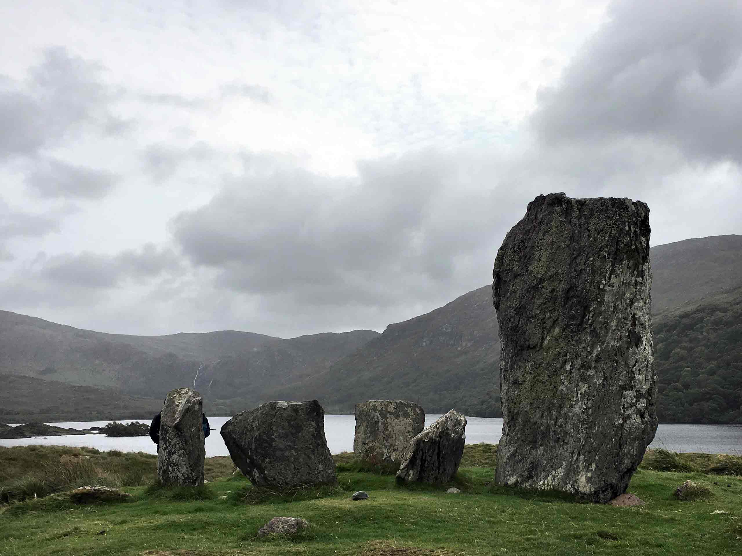 Am Lake Napeasta besuchen wir einen mystischen Five Stone Circle, den Uragh Stone Circle, am Lough Inchiquin. Wir sind die einzigen Besucher und so setzen wir uns in seine Mitte, genießen die Ruhe, philosophieren über Urzeiten und lassen unseren Geist entschweben. Nach einer halben Stunde kehren wir zu unserem abgestellten Motorrad zurück und finden es umstellt von einer Herde rabenschwarzer Stiere. OK! Etwas Mut auspacken und einfach durch die Herde von sicher 25 grimmig dreinschauenden Galoway Rindern zum Motorrad durchgehen. Ich starte und die Viecher machen schön langsam Platz. Wer sucht, der findet hier viele prähistorische Monumente, Menhire, Hügelgräber und viele Steinkreise.