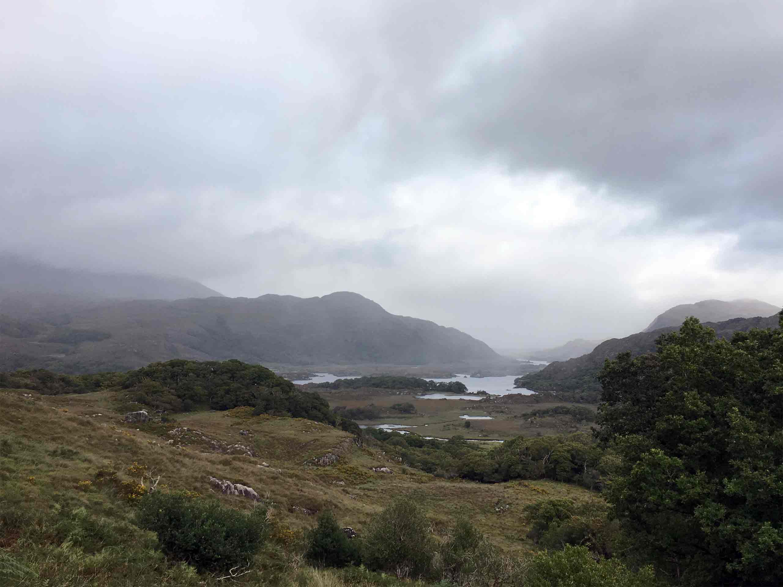 Ein weiterer Ausflug führt uns am nächsten Tag wieder ins Landesinnere. Ab Kenmare fahren wir dem Slaheny River entlang durch ein Naturschutzgebie, das Wildtiere wie Lachs, Otter und Seevögel beherbergen soll, nach Killarney. Der Fluss und seine Umgebung sind ein wichtiger Teil des Wild Atlantic Way und bieten atemberaubende Landschaften. Allerdings ist es heute auch wieder recht regnerisch und daher kalt. So halten wir uns auch nicht lange in der Stadt auf. Diese kleine Stadt liegt nicht direkt am Lough Leane. Wir sehen den See erst, als wir wieder auf der Route des “ Ring of Kerry“ in Richtung Kenmare unterwegs sind. Die N71 ist sehr stark mit Touristenbussen befahren, auch heute bei Regenwetter. Es ist aber eine sehr schöne, mit vielen Aussichtspunkten angelegte Panoramastraße.