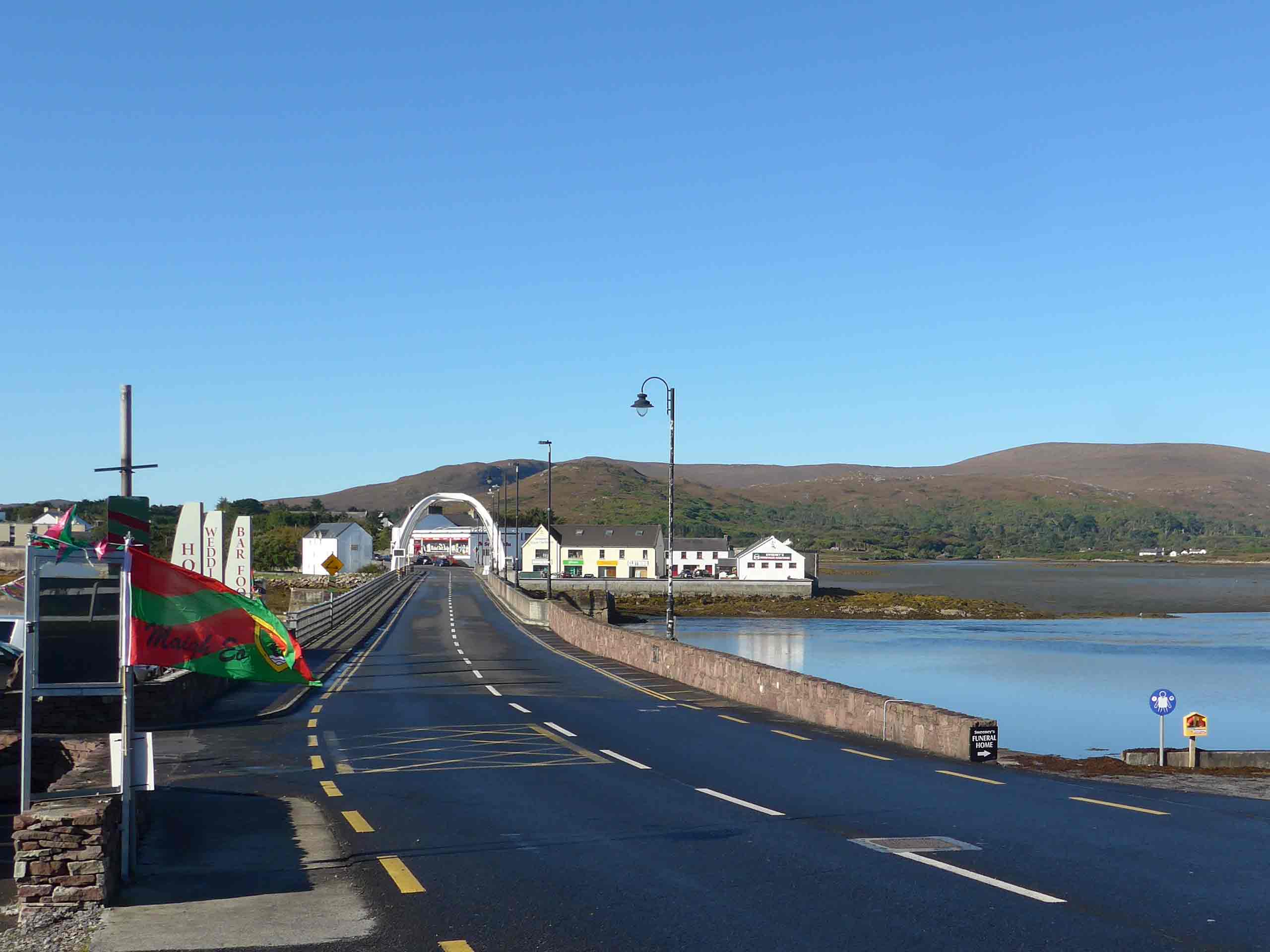 Am 14. September fahren wir den Wild Atlantic Way weiter über Galway, Casla und Clifden nach Castlebar, im County Mayo. Bei Clodagh, einer sehr freundlichen Wirtin, beziehen wir für drei Tage eine kleine Wohnung. Ein wunderschöner Tag und wir machen einen Ausflug zur Insel Achill Island in der Grafschaft Mayo, ein Signature Point am Wild Atlantic Way. Über weites Land erreichen wir die Michael Davitt Bridge, eine Drehbrücke, die den Schiffsverkehr bei Bedarf durchlässt, und fahren über diese auf die größte Insel Irlands. Auf ihr lebte eine Zeitlang der deutsche Schriftsteller Heinrich Böll. Hier schrieb er den interessanten Reisebericht „Irisches Tagebuch“. Wie so oft auf unseren gewählten Straßen in Irland, ist es auch hier sehr ruhig. Wir fahren bis zur Keem Bay, wo die Straße in einer malerischen Bucht mit einem feinen weißen Sandstrand endet.