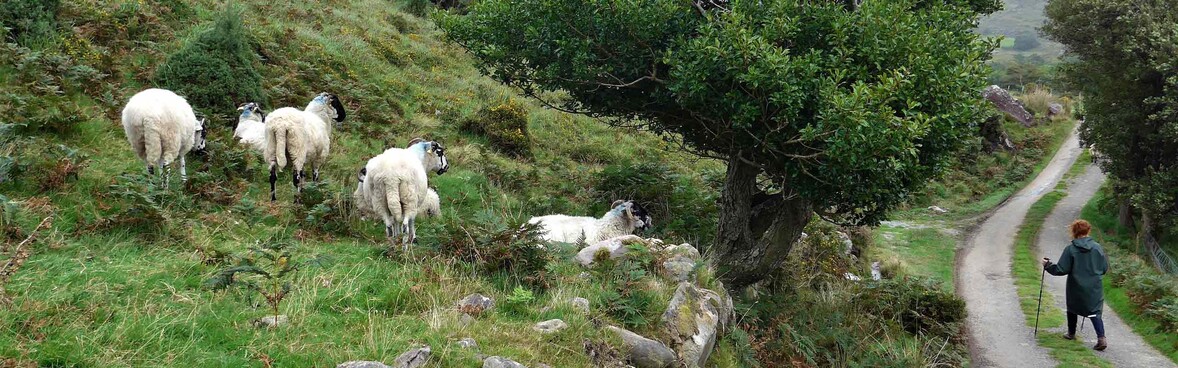 „Fahren wir jetzt auf einem Trampelpfad von Schafen?“, fragt mich Ulli. Wir befinden uns wirklich auf einer sehr schmalen Straße in Richtung Killorglin einer kleinen Stadt im Süden des County Kerry. Sie liegt am nördlichen Ende der Halbinsel Iveragh.