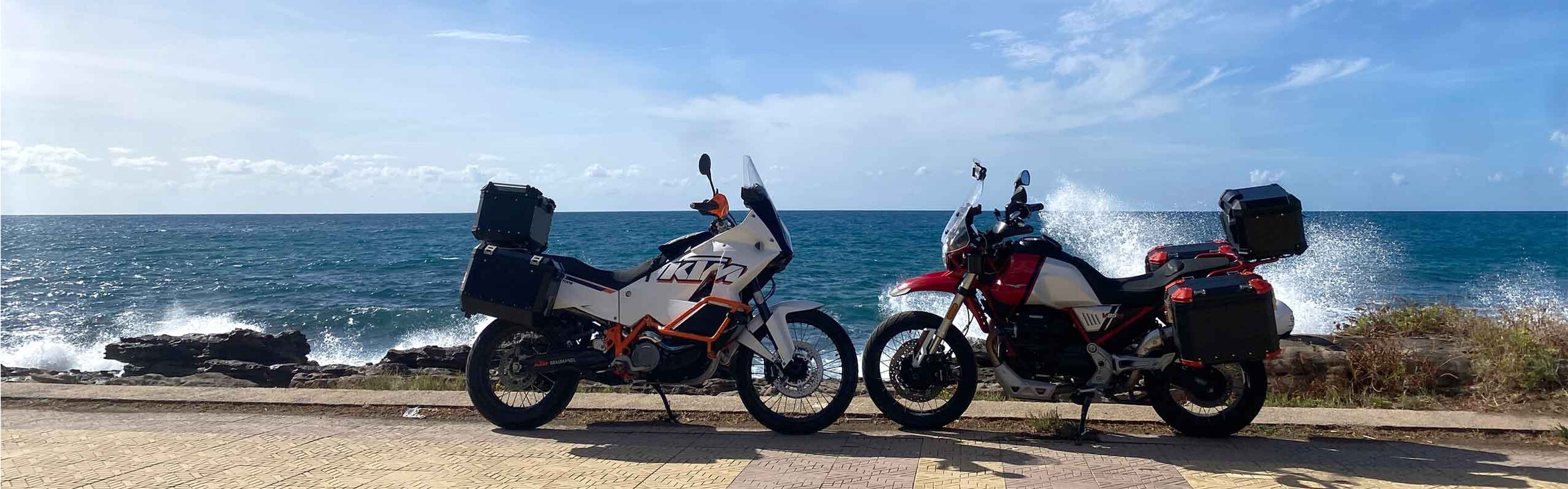 Bei Tortoli machen wir bei Sasso Gomme Halt, Reifenwechsel vorne ist bei der Guzzi V85TT angesagt. Ein extra freundlicher, singender „Caruso” montiert für den immer glatter werdenden Dunlop Mutant einen neuen Metzeler Tourance Next 2, den wir dann auf einer Extrarunde in die Berge gleich sportlich anfahren. Die SS198 steht ihrer berühmten Schwester an der Küste um nichts nach – nur der Asphalt ist älter, ein paar Schlaglöcher fordern präzises Fahren und die beschossenen Straßenschilder mahnen zum respektvollen Umgang mit der Bevölkerung. In Gairo stehen wir dann fasziniert vor den Ruinen eines verlassenen Dorfes, das als Mahnmal vor den Naturgewalten als makabres Freilichtmuseum dient. Leicht crazy ist auch die Stadtrundfahrt durch Jerzu, die uns Google vorschreibt: ziemlich eng, ziemlich verlassen, sehr rutschig und sehr sehr steil…