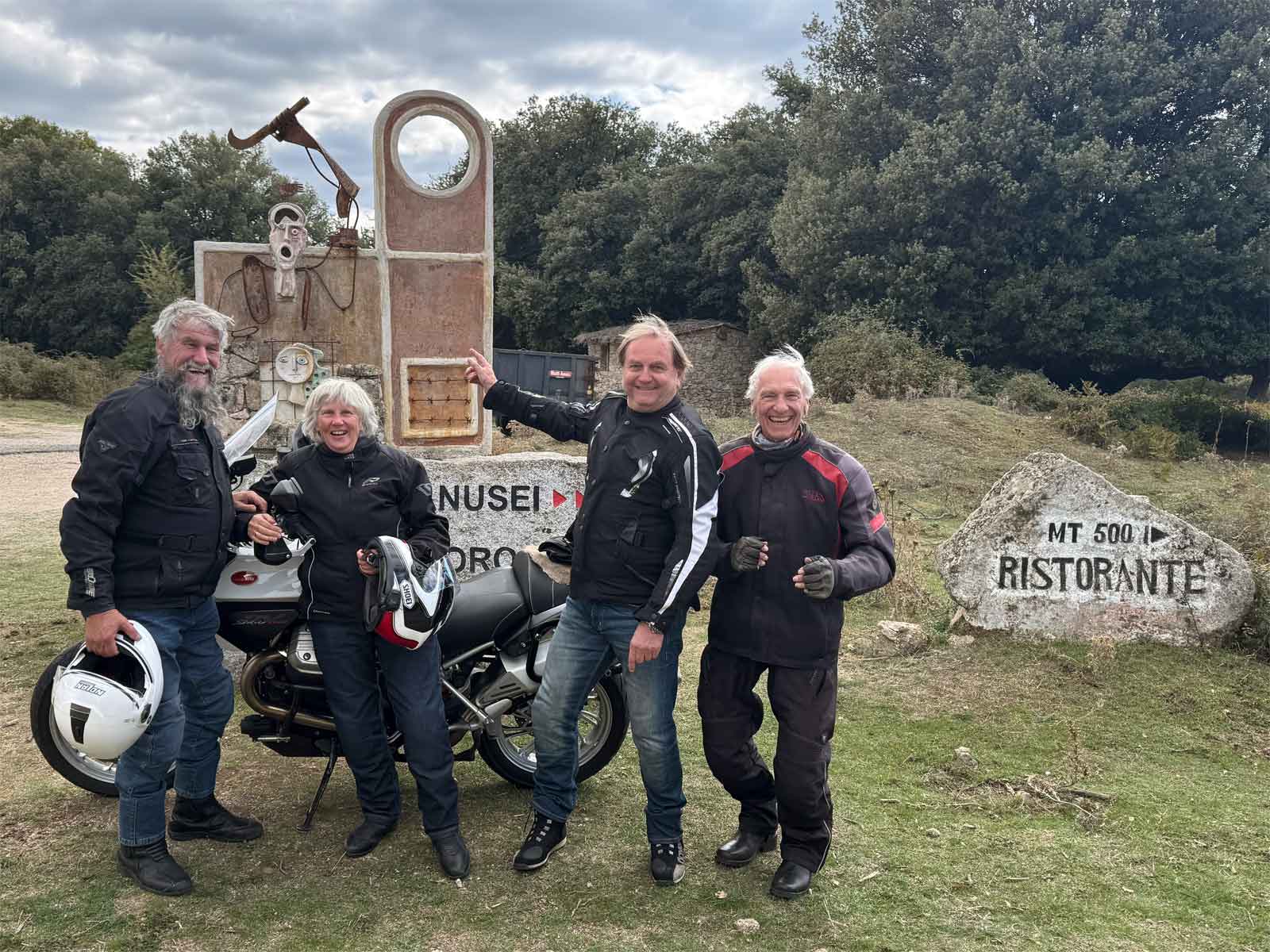 Tag 01: Regen am Morgen, Kälte am San Bernardino und in Lugano stürzt der See über wasserfeste Guzzisti. In Chiasso kilometerlanger Wochenend-Stau. Tatbestand Überholen auf dem Pannenstreifen. Am späten Nachmittag trudeln die Reisegruppen nach und nach in Genua ein. Ichnusa-Time auf der GNV Fähre nach 424 km. Tag 02: Sonniges Anlegen in Olbia. Frühstück um 65,- EUR im Cala di Volpe an der Costa Smeralda. Karim Ata Khan IV war dort, James Bond war dort, Lady Di war dort, und jetzt waren auch die Guzzisti Montfort dort. Später die Sonntagsmesse in der Kirche Stella Maris über Porto Cervo, die das berühmte Gemälde Madonna Dolorosa von El Grecco beherbergt. Dann der Flug nach Süden bis Cala Gonone. Punktlandung im Adlerhorst Nuevo Gabbiano direkt am Hafen. Tag 03: Frühsport mit integriertem Sonnenaufgang und sanftem Meeresrauschen im weichen Morgenlicht. Einschwingen auf der legendären SS125, erstes Gruppenfoto in Gairo, weiter Blick übers Land vom Punto Panoramio di Talana. Abends erste Pizza , weitere sollten noch folgen. Tag 04: Ab in die Berge über Lula nach Siniscola zur handgemachten Pasta im Biker-Treffpunkt Locanda Ammentos an der SP3. Grandioser Ausblick von der alten Straße nach Cala Gonone über die Bucht von Orosei. Dorade im Salzmantel, persönlich zerlegt von Chefmechaniker Massimo. Tag 05: Die SS125 zum Zweiten – bei Baunei links runter nach Santa Maria Navarrese. Baden am weitgehend leeren Strand. Von weitem locken die hohen Kräne von Arbatax. Gruppenfoto vor den roten Felsen. T-Shirt shopping am Passo Ghana Silvana. Tag 06: Berghauptstadt Nuoro, Cappuccino mit Aussicht im Parco Monte Ortobene. Kurveneldorado über Oliena nach Orgosolo. Studium der berühmten Murales (Wandmalereien) im berühmt-/berüchtigten Banditendorf. Lustvoll aus dem Wohnwagen zubereitete sardische Variante von Käsefondue auf dem Hauptplatz. Tag 07: knapp 250 km Kurventraining auf den Traumstraßen SS389, SS128, SP7, dazwischen Boxenstop für Bastianos Pasta im Is Cubas in Desolo. Glückliche Wald- und Wiesenschweine säumen den Weg zurück. Tag 08: Mit dem Taxi zum Dorffest Cortes Apertas nach Lula. Die Frauen öffnen ihre Stuben und servieren sardische Köstlichkeiten, basierend auf wunderbarem Käse und Honig. Die Männer öffnen ihre Weinkeller und schenken großzügig sardischen Göttertrank aus. Jugendliche offerieren Fotos ihres geschmückten Esels schon ab 2,50 EUR. Tag 09: Safari Tour mit dem klapprigen Landcruiser in den Supramonte. Die schönste Aussicht der Insel bietet der Monte San Giovanni, 1.316 m. Im Wald leben Schweine, Kühe, wilde Pferde, Ziegen und Schafe mit ihren cleveren Hirtenhunden. Und 300 Menschen, die täglich ohne Tische und Besteck ebenfalls im Wald des Supramonte hocken und im Ristorante Camping Club 70 einen Teil der Viecher verschlingen. Und die Kellner singen dazu. Tag 10: Tausch der Motorräder gegen ein 250 PS Schlauchboot. Wilder Ritt an die schönsten Strände der Ogliastra. Cala Fuili, Cala Luna, Cala Mariola, Cala Goloritze und die Grotta del Bue Marino. Strand-Playboy Kurt bricht im Minutentakt die Herzen dutzender Meerjungfrauen. Auf den Felsen räkeln sich Austrorobben. Tag 11: Große Süd-Runde über Perdasdefogu, dem Dorf der Hundertjährigen und den Rennasphalt der Panoramastraße durch ehemaliges Militärsperrgebiet. Tag 12: Abschiedsrunde auf der SS125 zum Felsen von Pedra Longa. Caffe macchiato mit Blick über die Bucht und den berühmten Kletterfelsen. Dolce far niente, während die Ziegen in den Feldwänden über die Seilartisten meckern. Tag 13: Arrivederci, letzter Espresso in der Bar Italia 90 von Bitti und die Guzzis bollern nach Norden. Gruppenfoto am Elefantenfelsen und letzter Stop am menschenleeren Strand von Spiaggia de Platamona, kurz vor Porto Torres. Tag 14: Genua in der Morgendämmerung, Nebel in den ligurischen Hügeln, 8° C in der Poebene, erst nördlich von Mailand wird's wärmer. Königswetter in Lugano, der See bleibt diesmal am Boden. Und weil´s so schön ist, fliegen die Adler aus Mandello über den Sand Bernardino Pass. Letzte Gruppenaufnahme bei 17°C auf 2.066 m. Zäh wie immer die letzten 100 km bis zum traditionellen Bier in der Werkstatt. Il Padrone Guzzisti Traugott ist auch da...