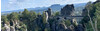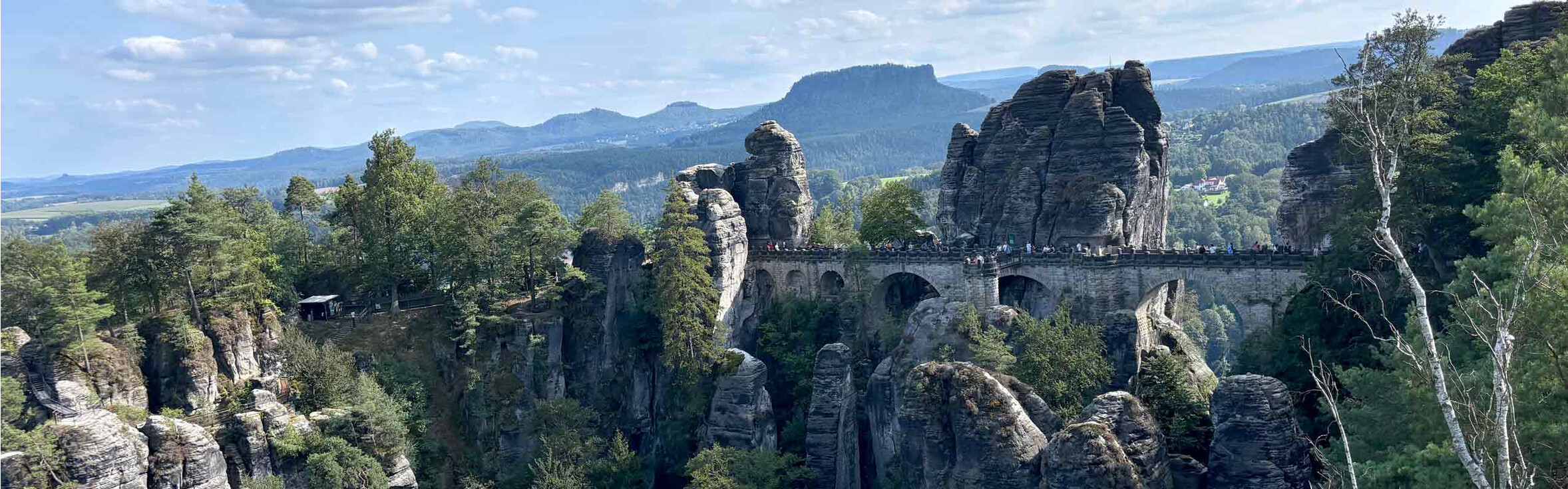 Lange stehen wir an der Felsabsturzkante am Geländer und genießen den wunderschönen Ausblick, bevor wir uns inmitten der vielen Touristen auf den Weg über den Basteifelsen über viele Steinstufen zur Basteibrücke aufmachen. Auch hier hat jede Felsspitze, jede Schlucht und jede Felsnase ihren eigenen Namen. Die sandsteinerne Brücke, die sich über sieben Steinbögen spannt, hat eine Länge von 76 Metern. Nach einer guten Jause sitzen wir wieder auf unserem Gefährt und fahren über Lohmen nach Pirna an der Elbe und weiter bis Heidenau und Lauenstein zurück nach Bahratal ins Bielatal.