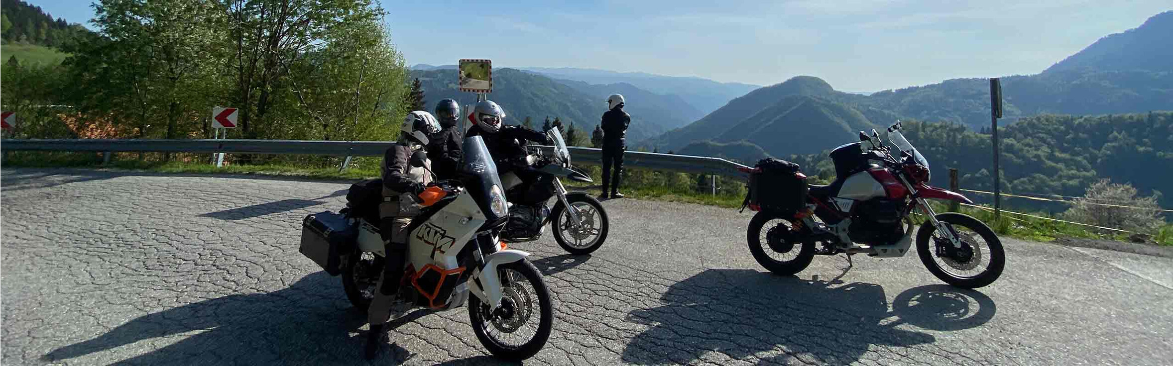 Endlich dann doch der Vršič Pass mit seinen 24 Tornante auf der Nordseite, die teilweise noch mit Kopfsteinen gepflastert sind, für die russische Kriegsgefangene im WK 1 bluten mussten. Der mit 1611 m höchste befahrbare „asphaltierte” Pass Sloweniens bringt die vollbeladenen Bikes ordentlich zum Klingeln, das Ölthermometer der Guzzi V85 TT zeigt Rekordwerte (140° C) – ein externer Ölkühler wird beim nächsten Service ernsthaft diskutiert werden müssen.